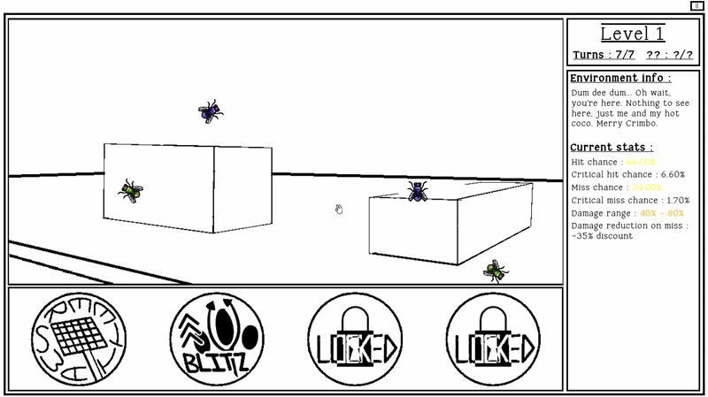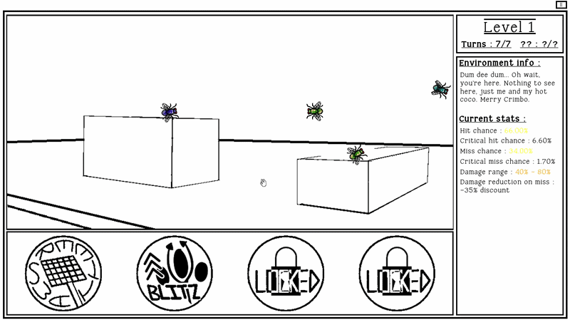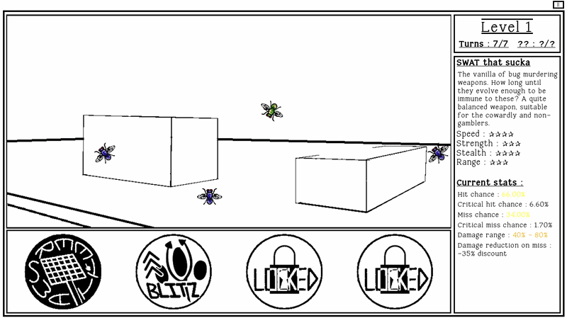 Hey! Here's the temporary guide in place of the tutorial. Your goal is to kill all the bugs on screen before you run out of turns. You can do a normal or a buffed attack each turn. In normal mode, you can only use the buffed attack once per level, so think carefully of when you want to rip it. After that choose where you want to attack on the grid. You can see your stats on the right! Click confirm to proceed. If you accidentally clicked on the wrong spot, just click again to un select. Pink sqaures are obstacles, so you can't directly attack there! Attacks with obstacles in the periphery are debuffed and doo less damage. That's it really. Itll get more complex when the full thing is out, with environmental effects, more weapons, and special moves!
